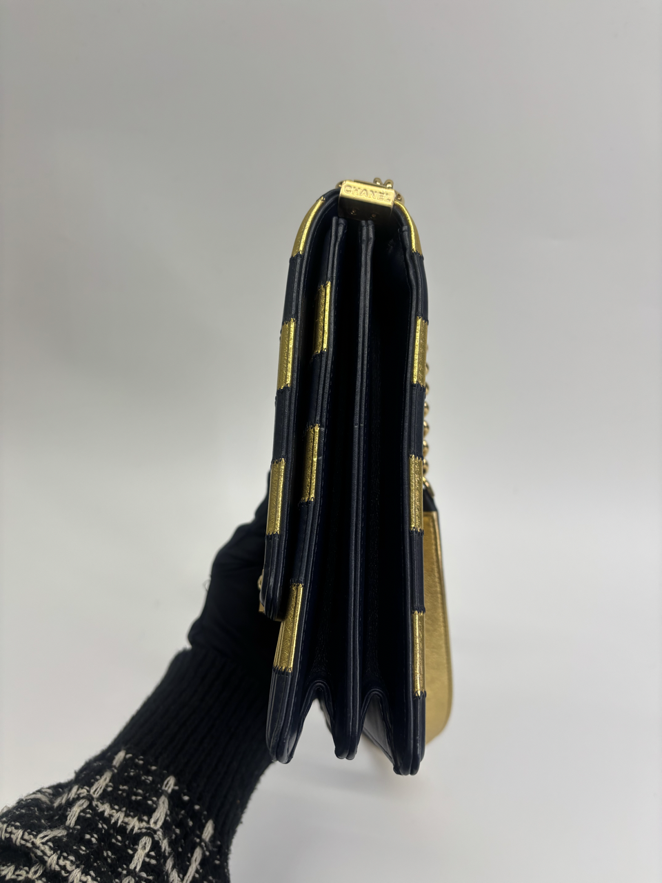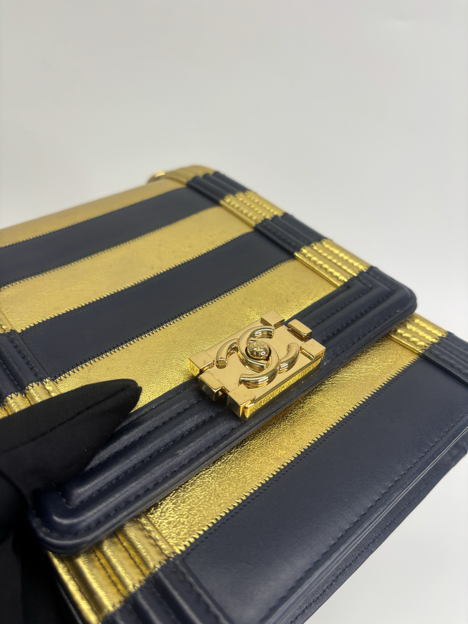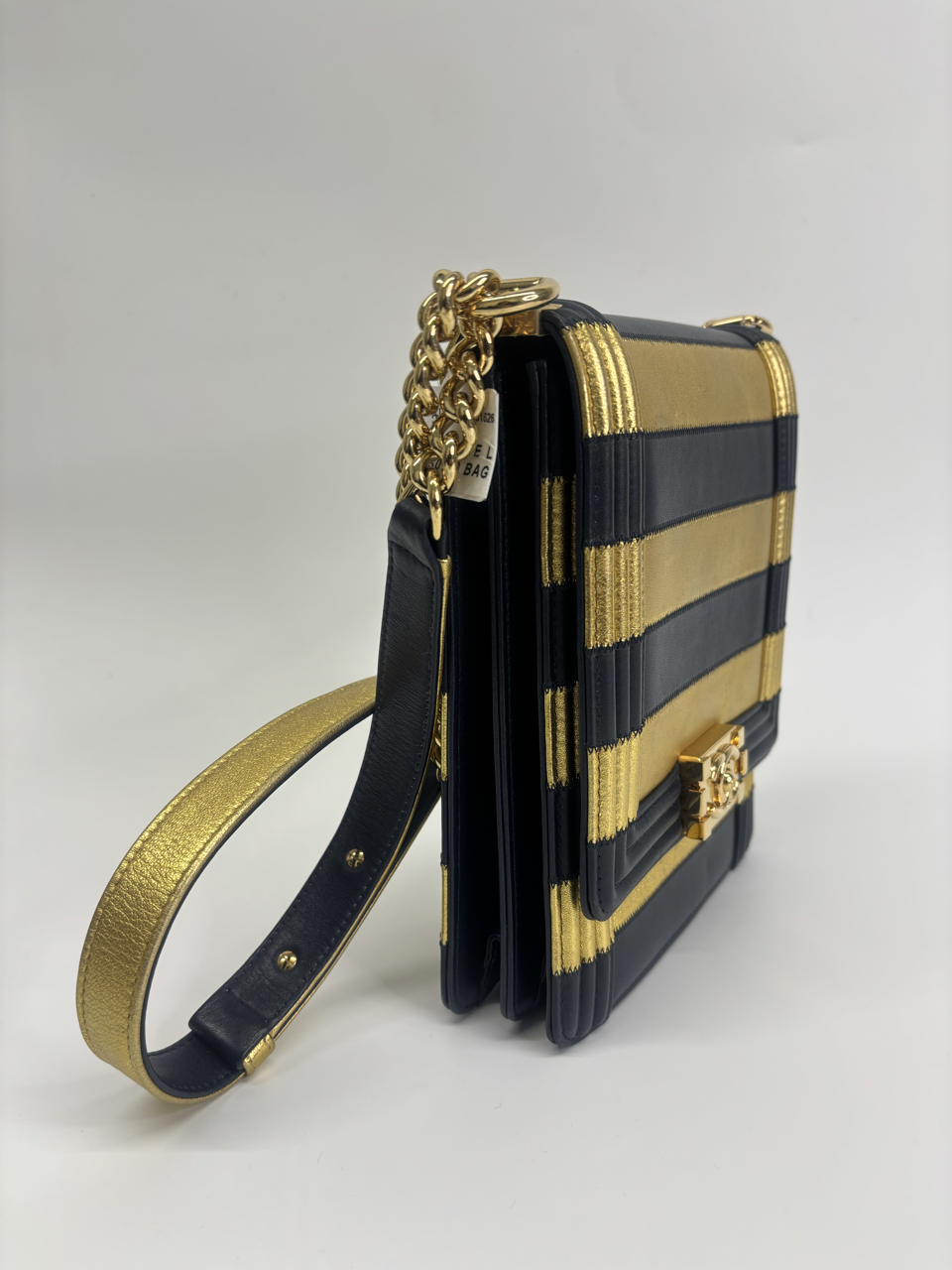 CHANEL METALLIC LAMBSKIN STRIPPED NORTH SOUTH BOY FLAP