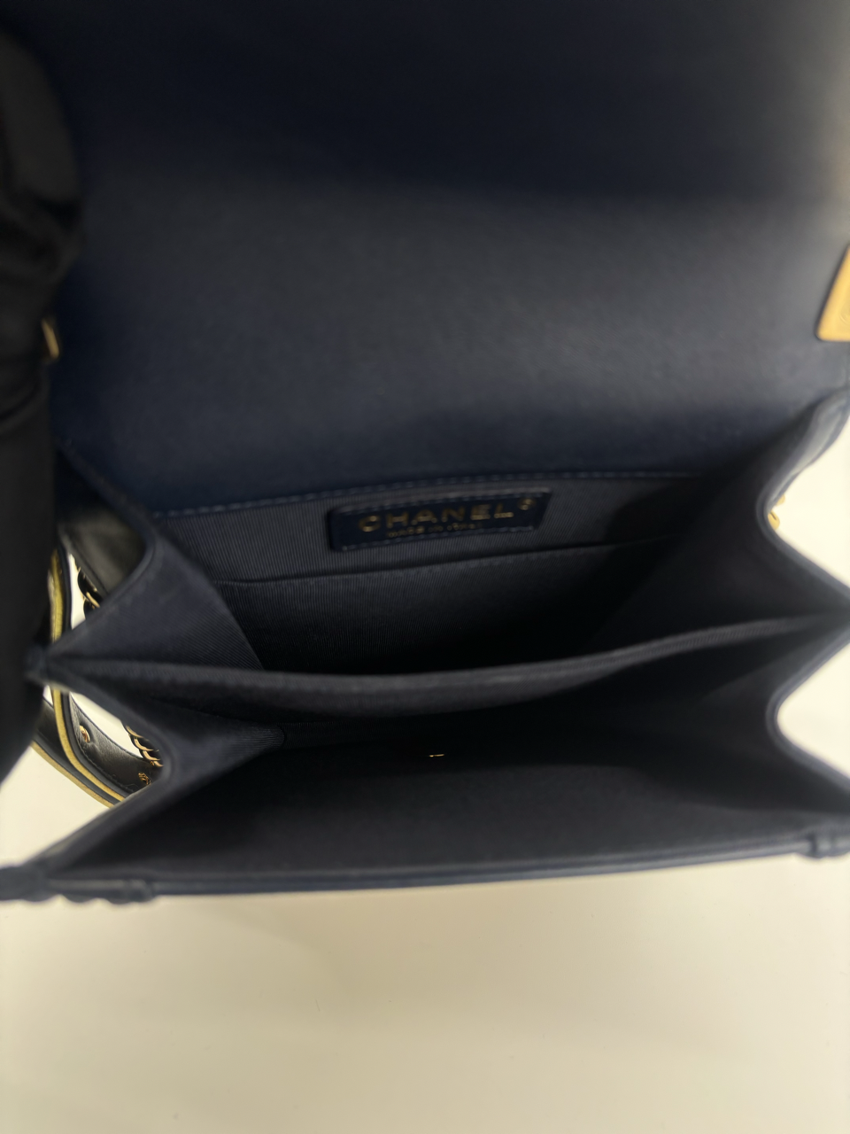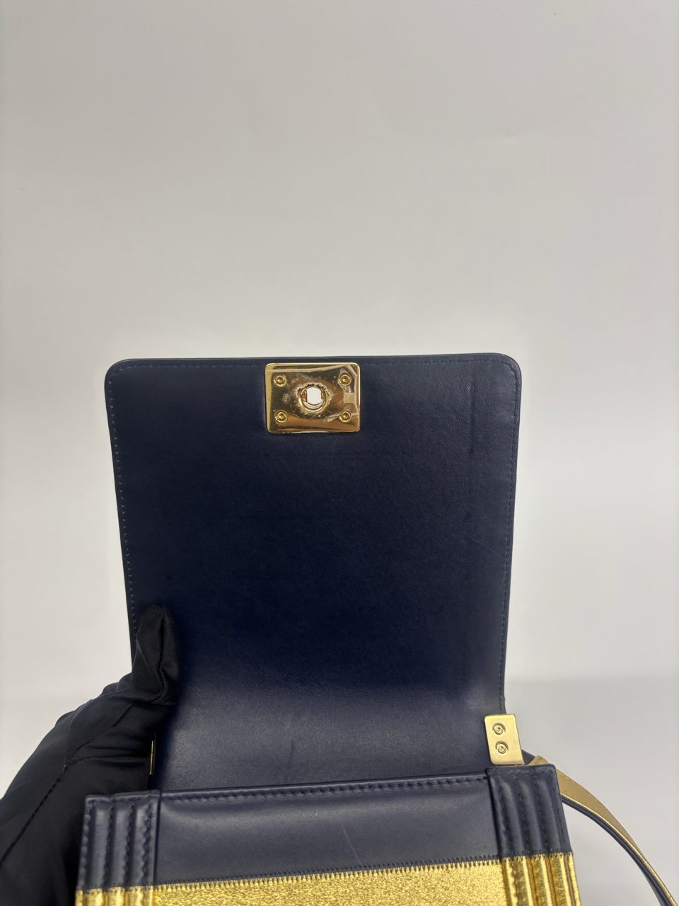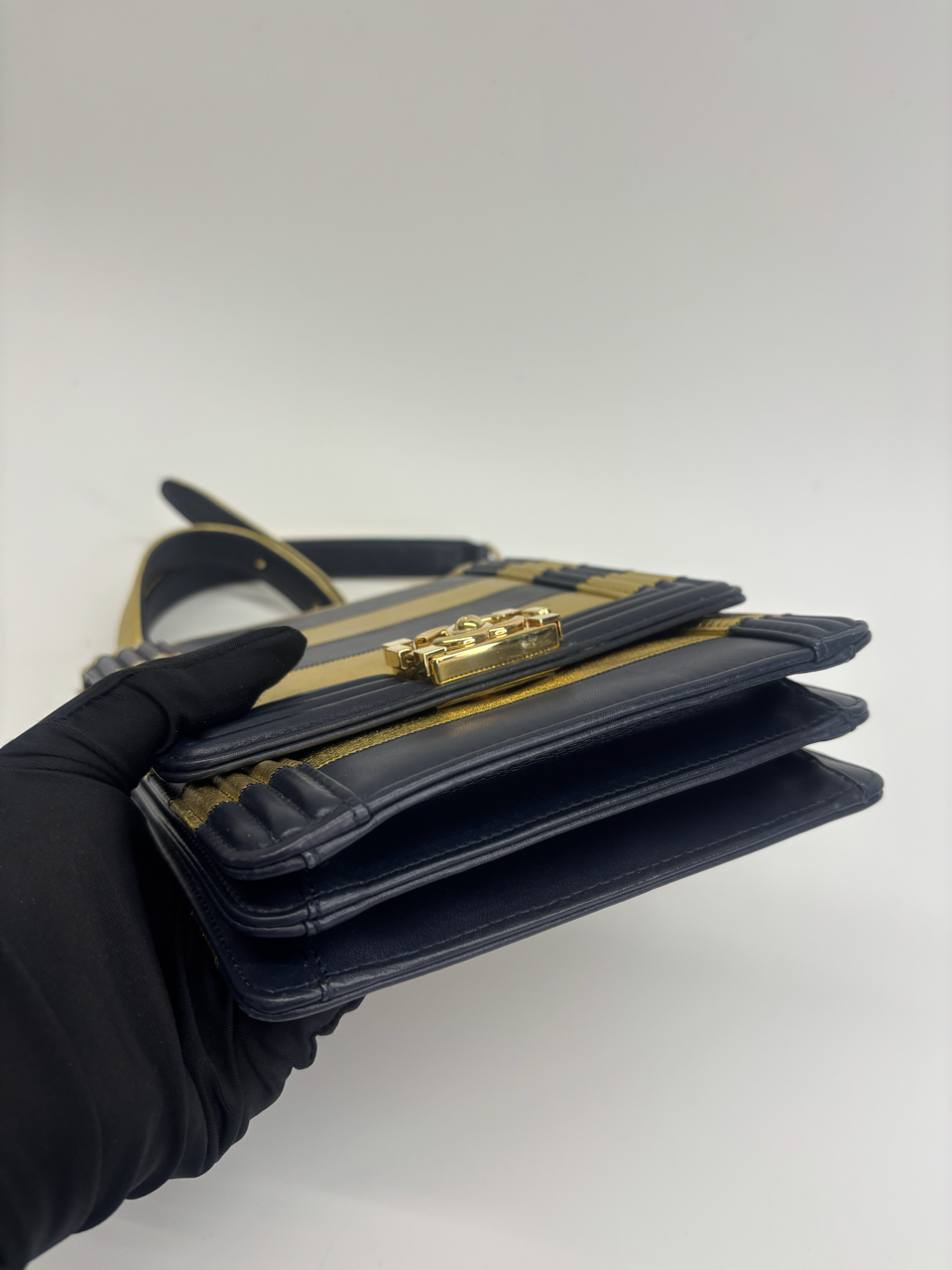 CHANEL METALLIC LAMBSKIN STRIPPED NORTH SOUTH BOY FLAP