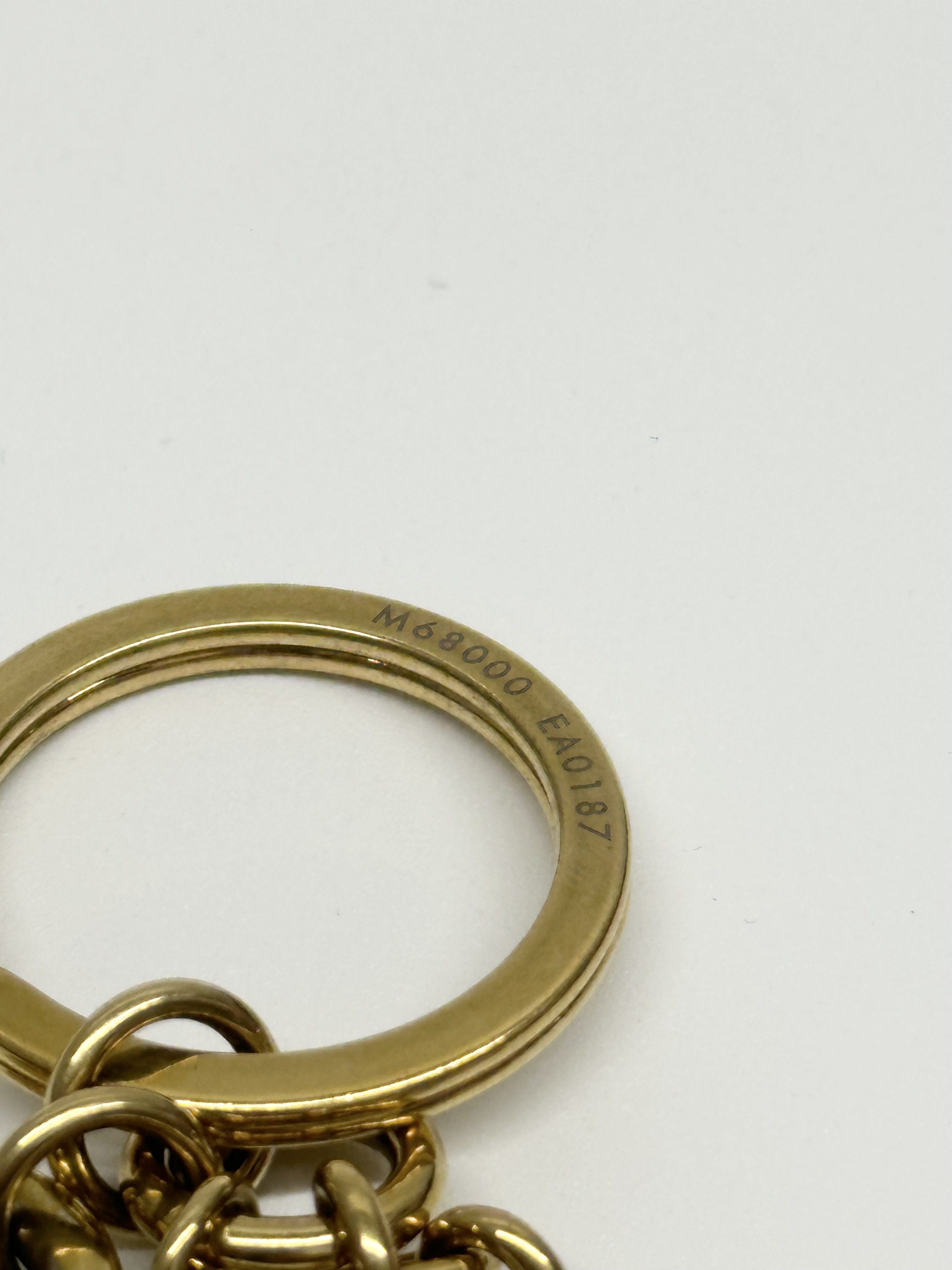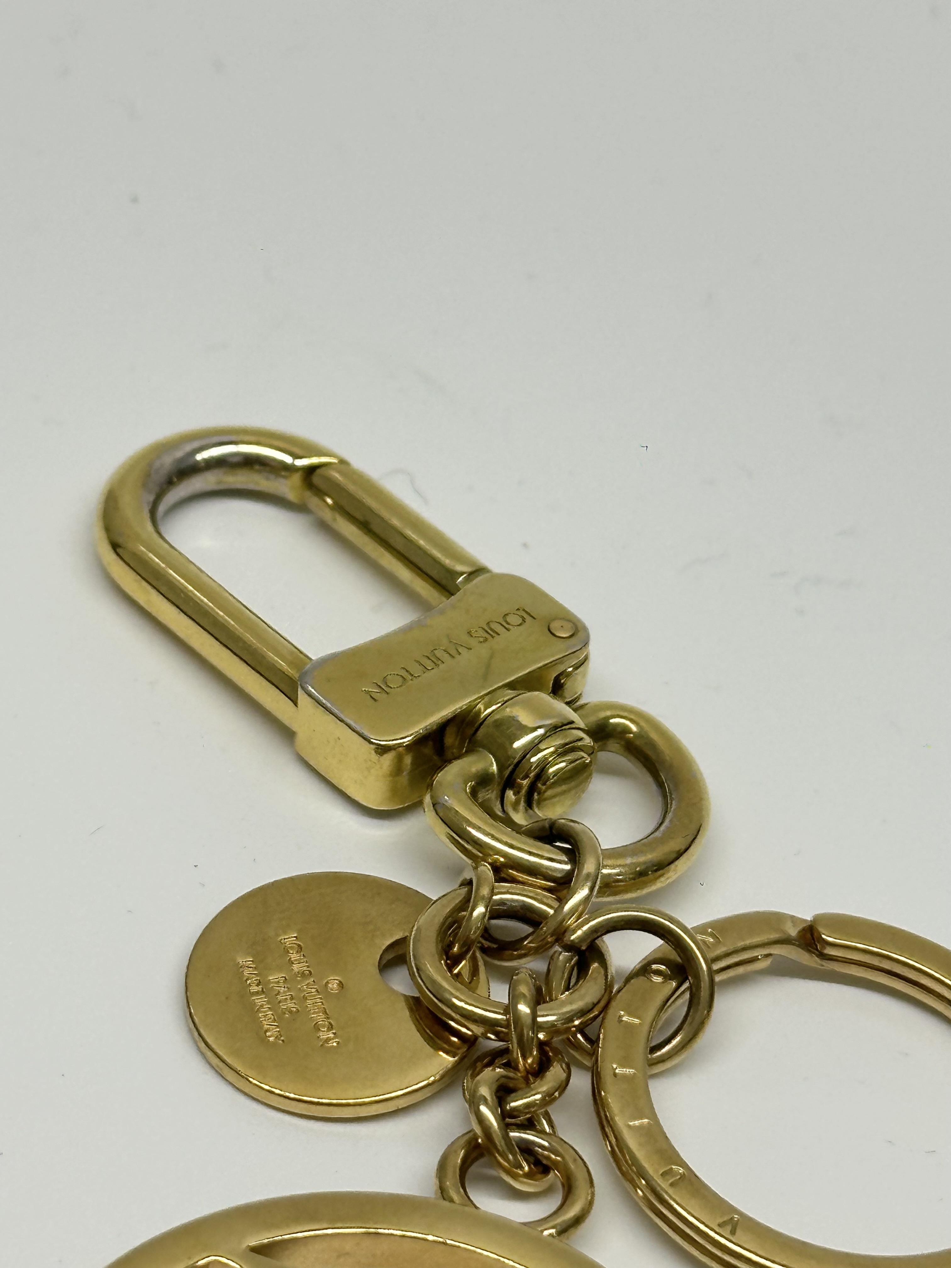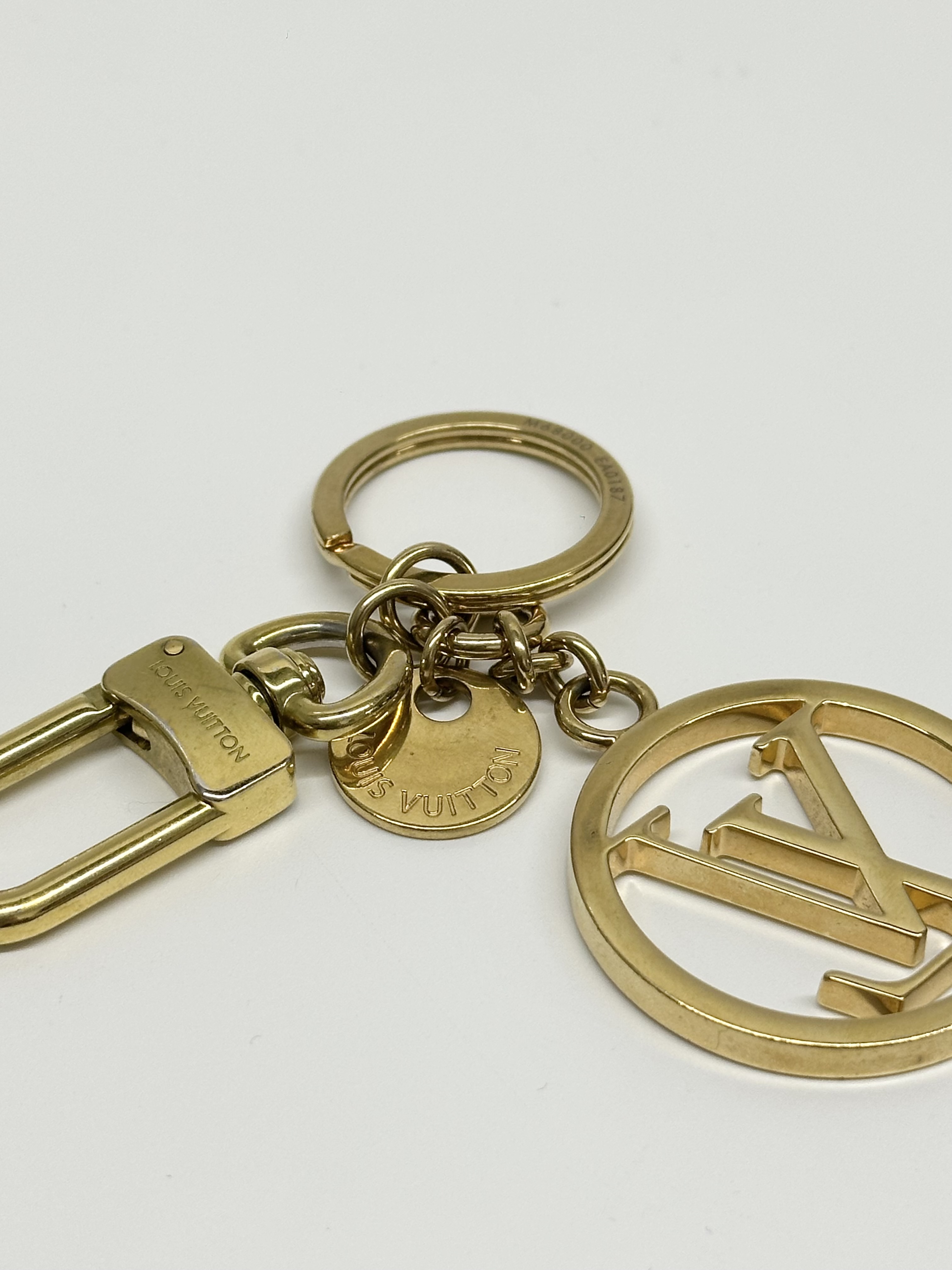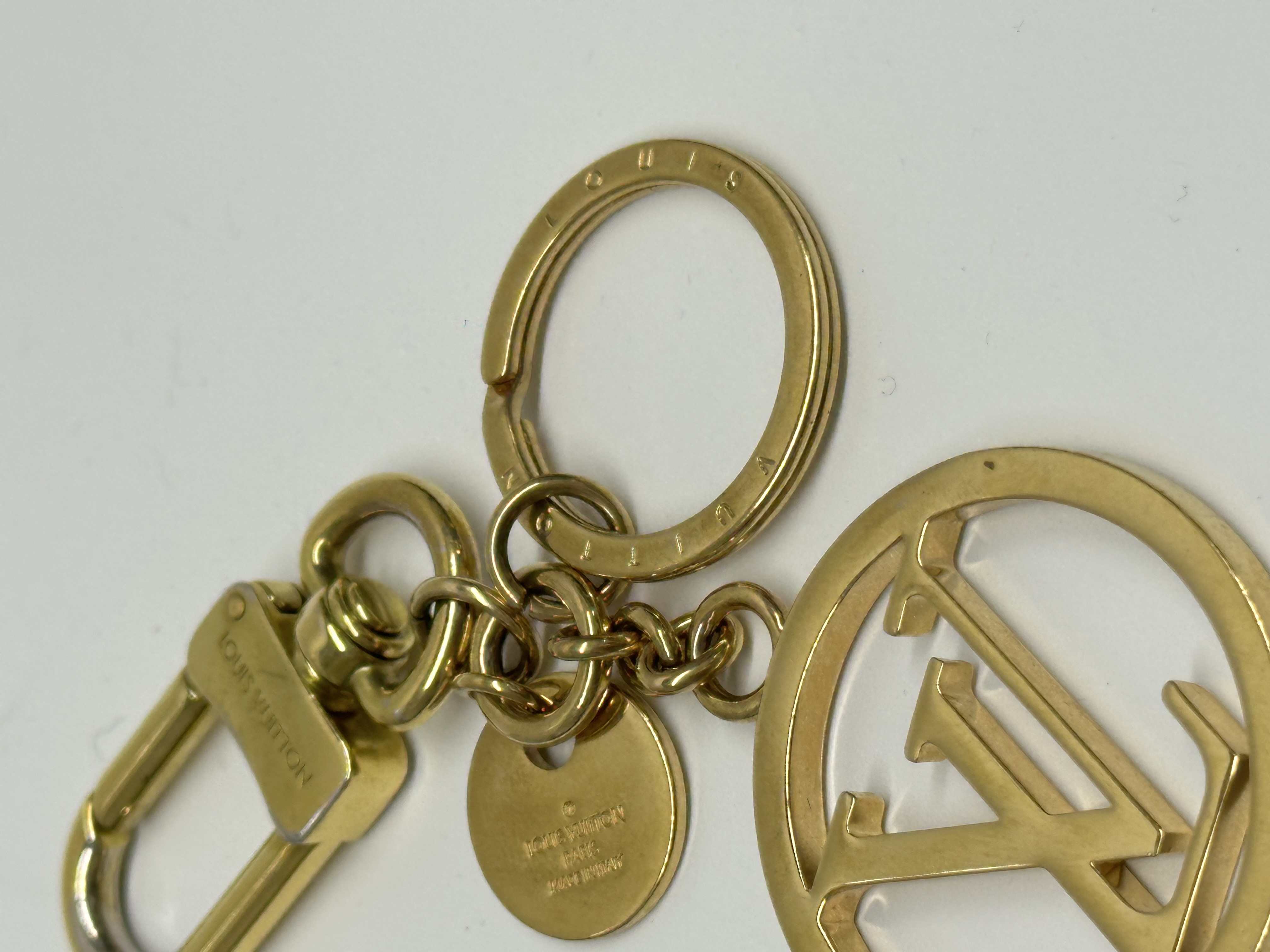 Design: It features a large, iconic LV Circle cutout charm, a snap hook, and a circular key ring, all in a gold-finished brass.