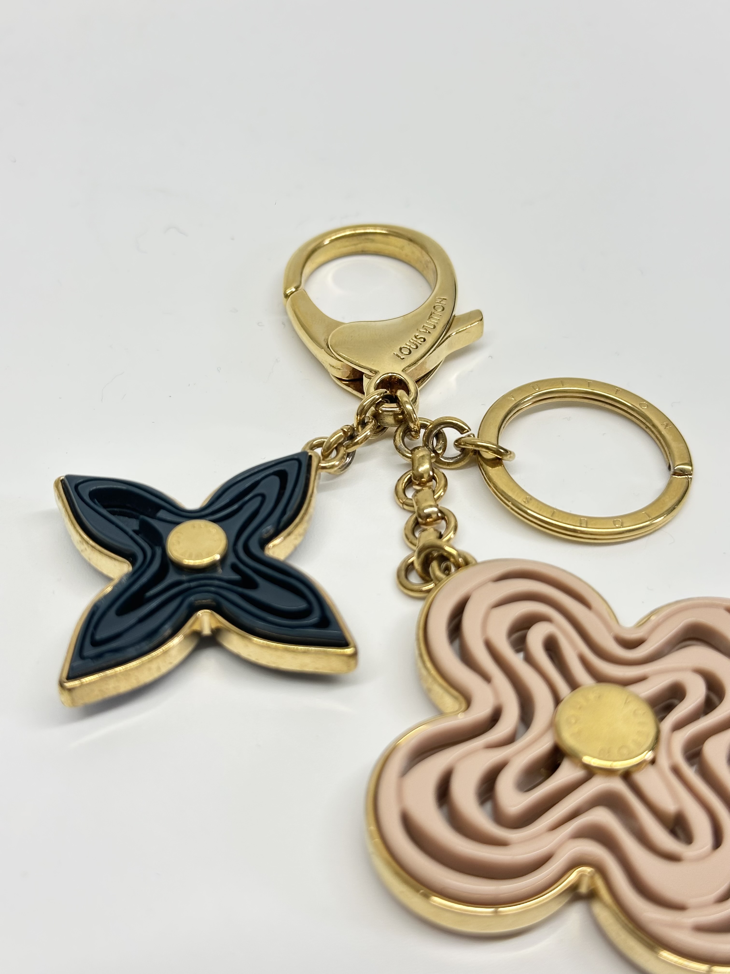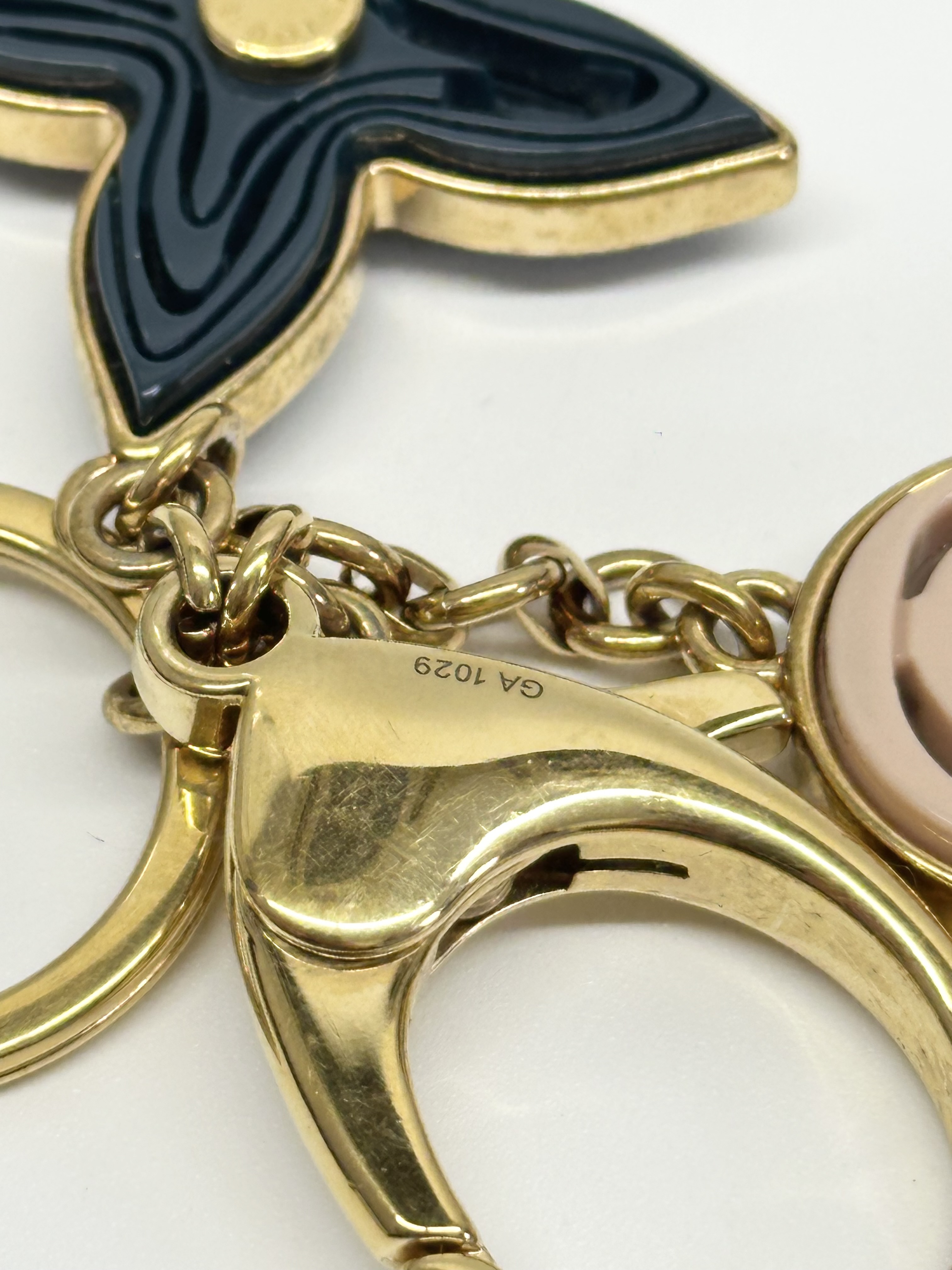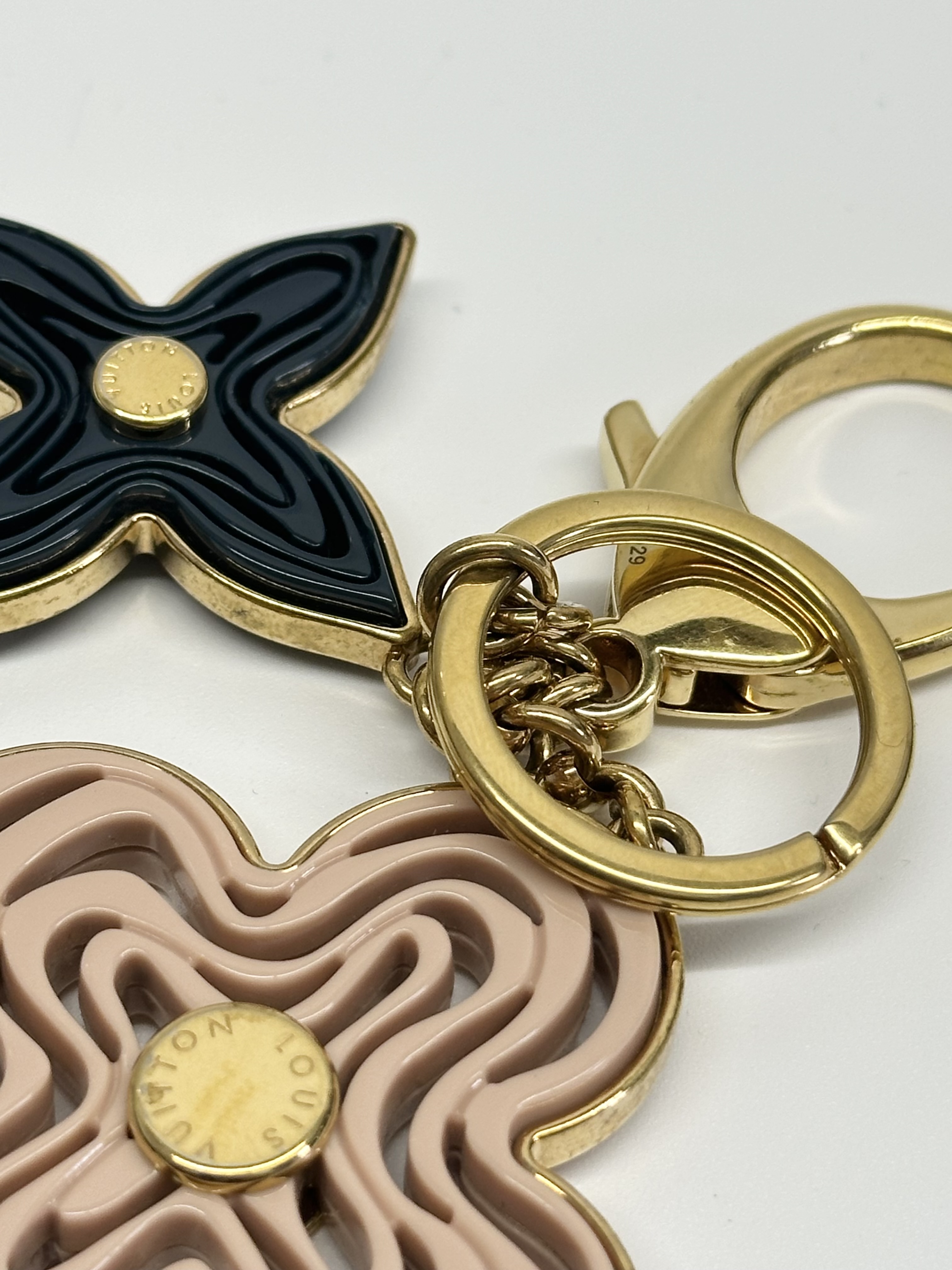Materials: A mix of polished gold-toned brass and acetate (the plastic material used for the flowers).
